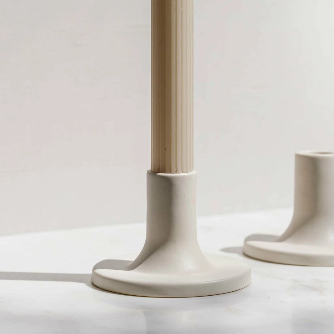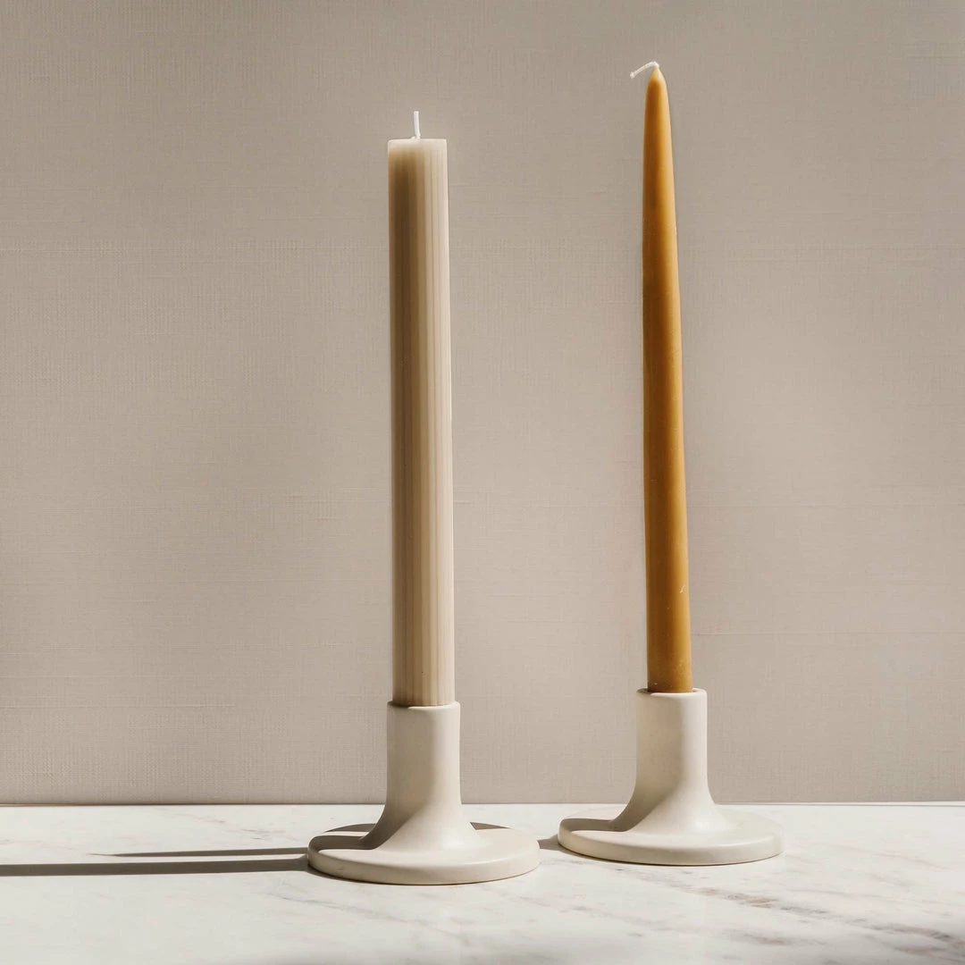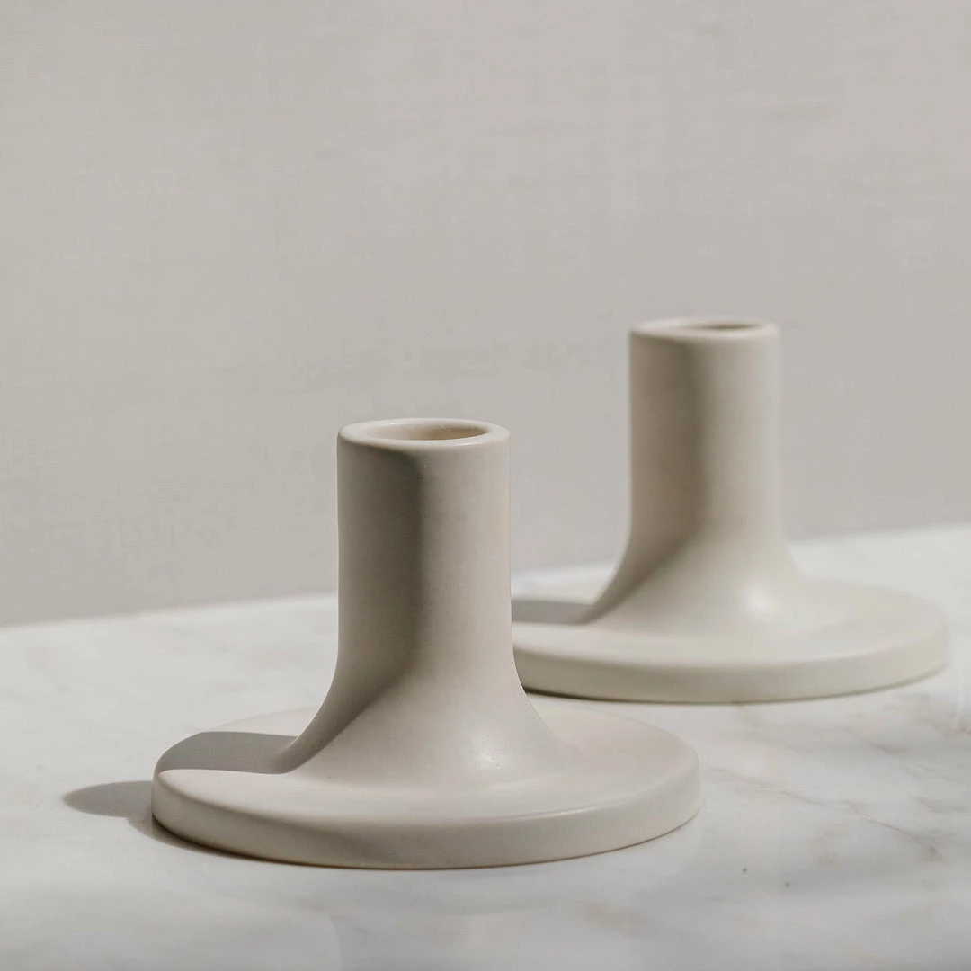 Our ceramic taper holders offer a fresh variation in shape and size and boast a clean, matte-white finish. With the stand-alone appeal, they also feel dynamic as a collection. Each holder is sized to fit a standard taper candle.