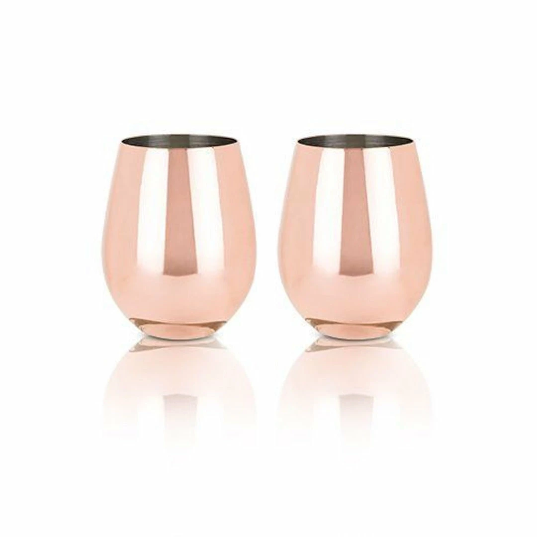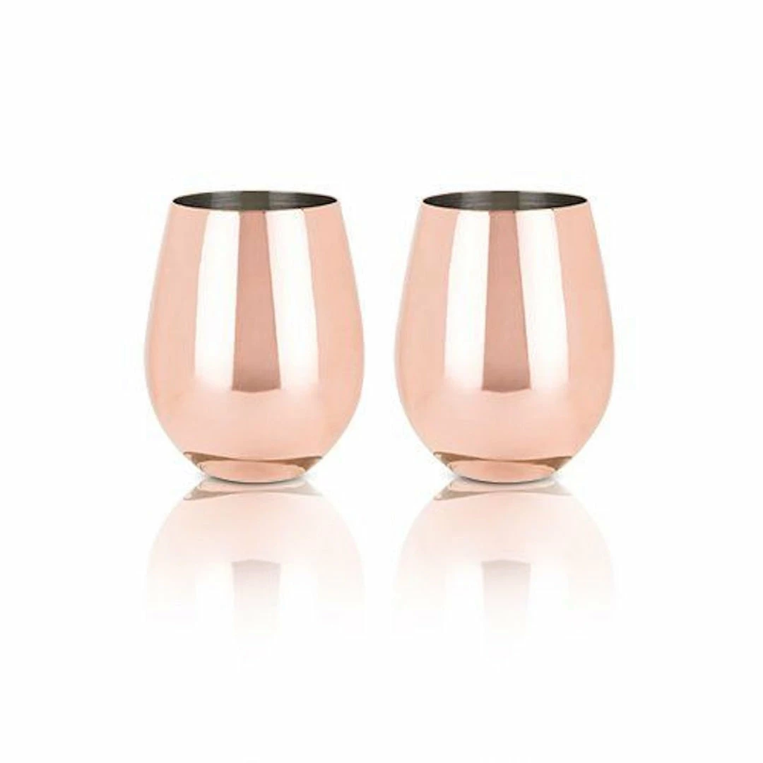 Savor Sauvignon Blanc and Chardonnay from an eye-catching pair of stemless copper tumblers. Each polished and perfectly rounded to fit the curve of your palm, these mirror-finished metal glasses collect and intensify the aromas of your drink for an appetizing taste every time.