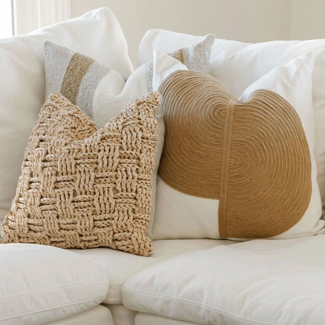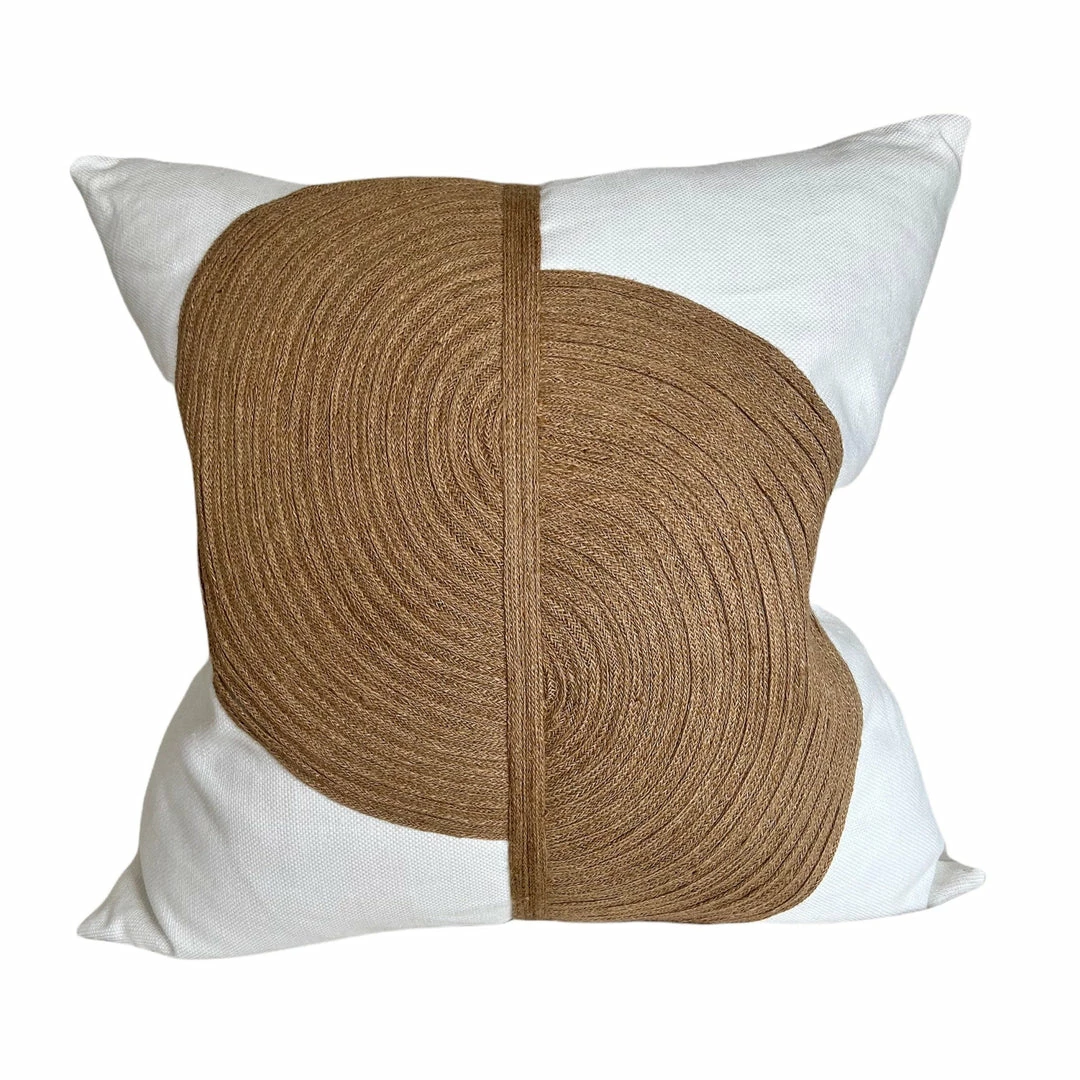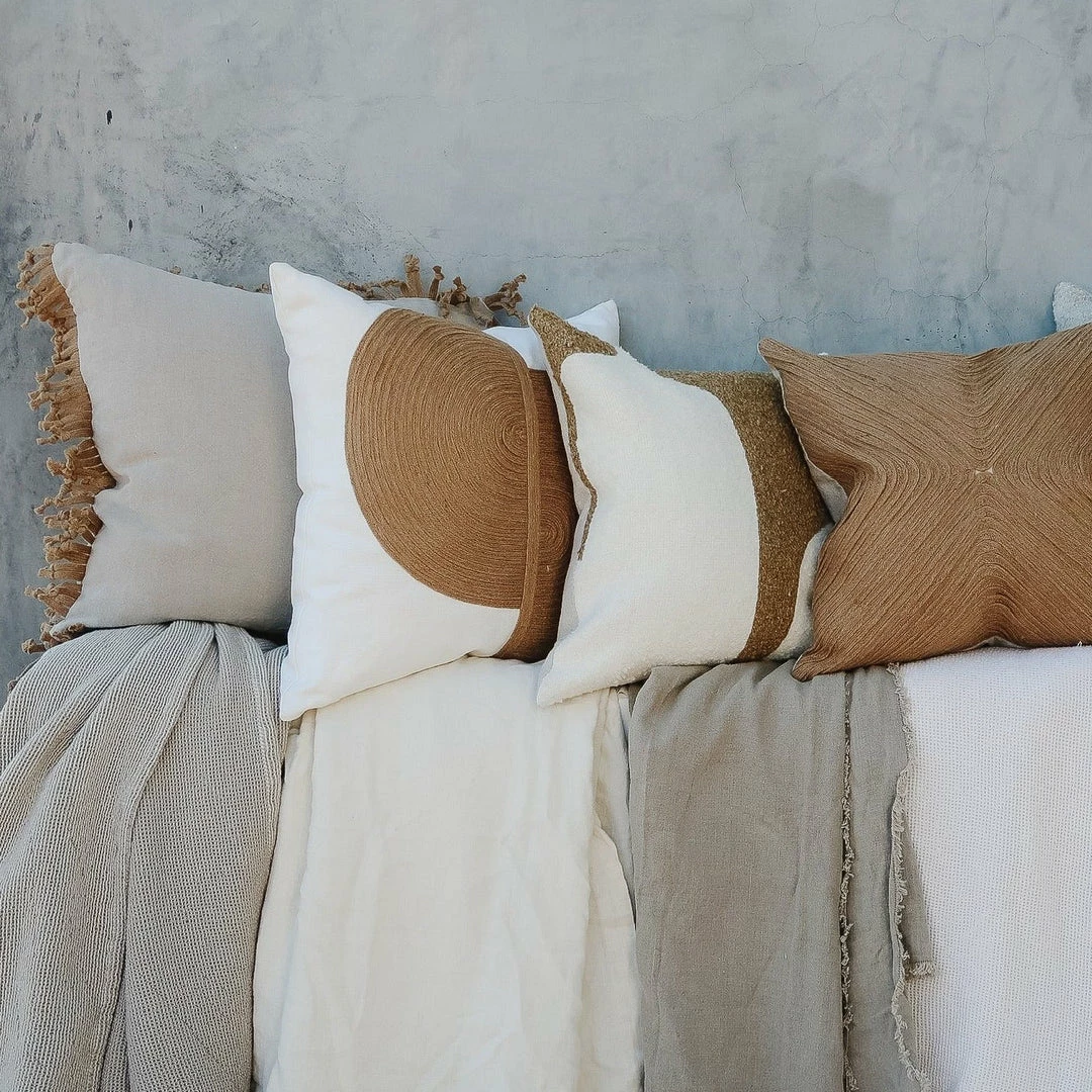 This throw is an oyster body with warm golden details stitched in natural cotton cords. With contrasted abstract patterns, this unique piece is likely to be the showstopper in your living space. This pillow is filled with a high-quality down insert for maximum comfort and shape. The cover can be removed for cleaning by a concealed zipper. (Pairs well with Samba Pillow and Cairo PIllow, but are sold separately)