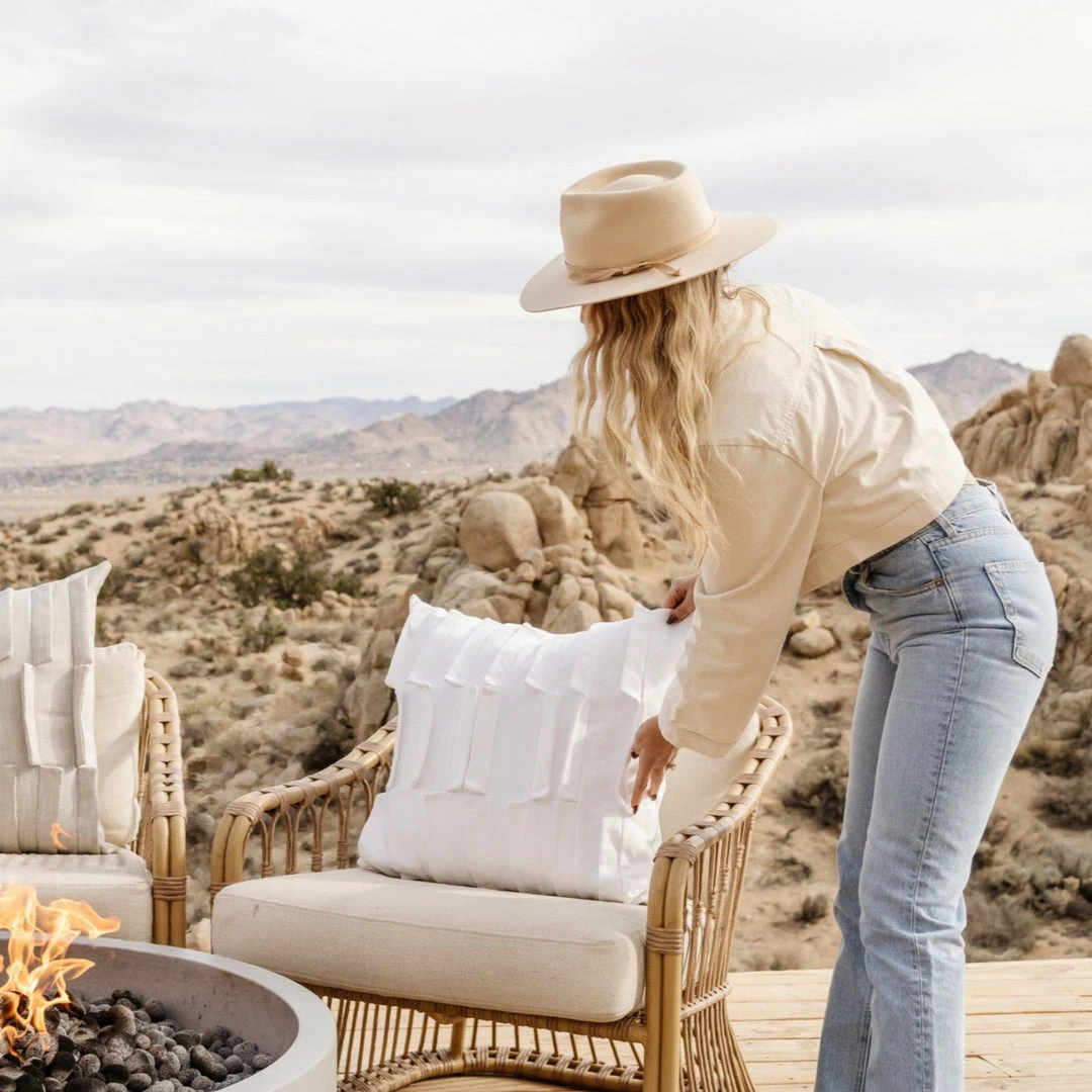 This decorative pillow inย oysterย will add a casual vibe to your indoor/outdoor lounges. With a pulled interactive pattern, this textured throw will be the main talk of the “she-shed”. Filled with an outdoor-friendly foam to withstand weather and maximize outdoor comfort.ย
