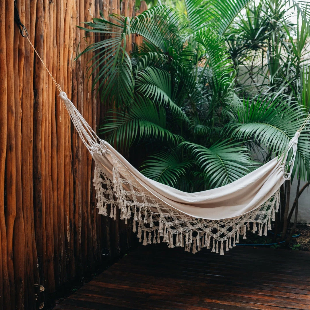 Kick it between the trees with this macrame hammock. Whether you find yourself in a tropical oasis, or in the comfort of your backyard, this hanging lounger will bring you to the ultimate relaxation mode.ย