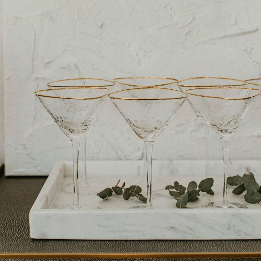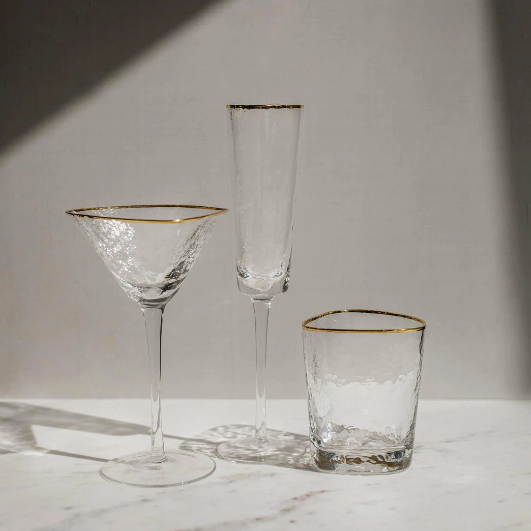 This Martini Glass features a unique triangular shape with a metallic gold rim and a textured glass design with a stem.